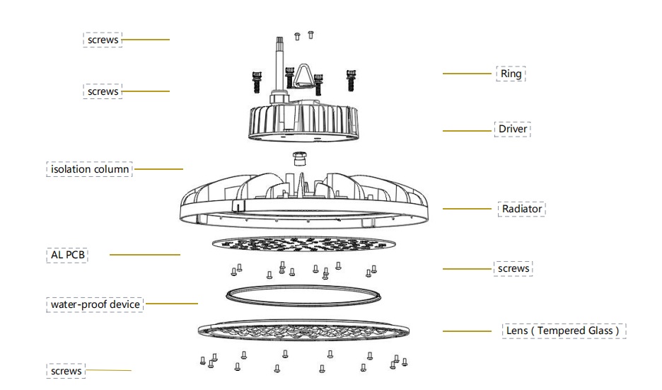 Install expansion bolt or hook in advance at the locaton where high bay is to be installed(Load capacity of expansion bolt or hook is three times greater than the weight of high bay).